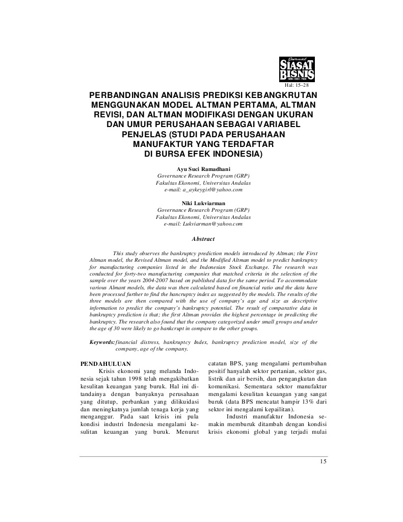 EP 2016 (63) 1 (89-105) 91 BANKRUPTCY PREDICTION MODELS IN THE SERBIAN AGRICULTURAL SECTOR other studies that followed. Beaver found that a number of indicators could discriminate ... Retrieve Full Source